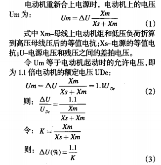 圖1所示為母線槽系統的某一段接線圖,圖2為電動機切換時的等值電路圖。圖中Us-電源電壓;Ud-母線槽上電動機的殘壓;Xs-電源等值電抗;Xm-母線槽上電動機組和低壓負載的等值電抗(折算到高壓母線槽壓);AU-電源電壓與殘壓之間的差拍電壓。