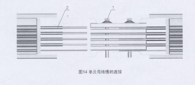 先取出序號1連接螺栓,然后將序號2母線槽插入,再穿上序號1連接螺栓,墊入碟形墊圈,用扭力板手將螺母擰緊(扭趴不小于6ONm),然后裝上蓋板(見圖),擰緊接頭螺栓足母線槽連接的保證。緊固后的接頭檢查要求用0.1mm的塞尺不能插進。