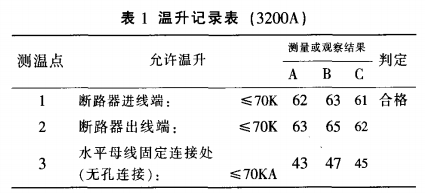 表2是溫升試驗室的質檢人員按照國家標準GB7251.1-1997的有關條款對該樣柜進行溫升試驗,對整個母線槽體系的關鍵處和搭接面進行測量(測得部分溫升記載)