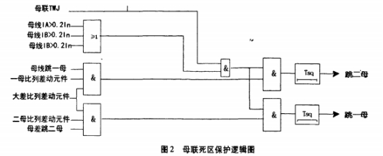 若母聯開關和母聯TA之間發生故障,斷路器側母線槽跳開后故障依然存在,正好處于TA側母線槽小差的死區,為進步保護動作速度,本設備專設了母聯死區保護,其邏輯框圖如圖2。