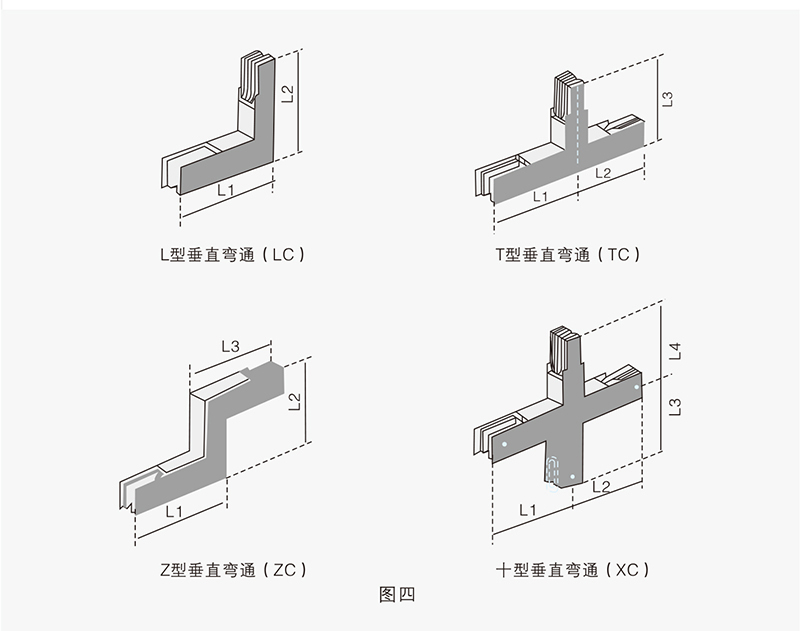 備有供水平及垂直連接的L型、T型、Z型和十字型四類八種,用于水平及垂直配電線的連接及改變母線走向。