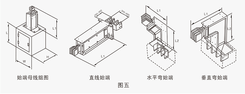 始端母線與始端進(jìn)線箱配套組成母線槽與電纜、配電柜、變壓器的連接件(圖五)作用于母線槽的電源輸入或輸出端,始端母線分:直線始端,水平彎始端,垂直彎始端。始端進(jìn)線箱外形尺寸W×H視用戶的電器設(shè)備尺寸而定。見(jiàn)圖五